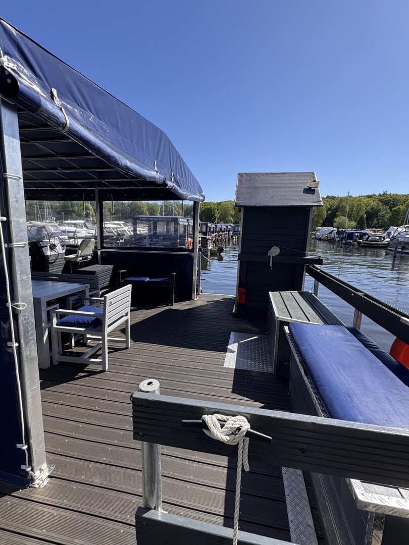 schönes Floss zum grillen und feiern für 30 Pers. mieten. Bestens geeignet für Familienfeiern, Geburtstage, Junggesellenabschiede, Firmenevents und Tagestouren durch das Seengebiet der Havel und den Wannsee. Mit einer gemütlichen Lounge ausgestattet, Tisch und Stühle sowie einer Badeleiter. Ebenso ein Verdeck über die hälfte des Floßes was auch komplett geschlossen werden kann. Ein Gasgrill mit Gas, eine Musikbox, Polster und ein Wc sind inklusive.