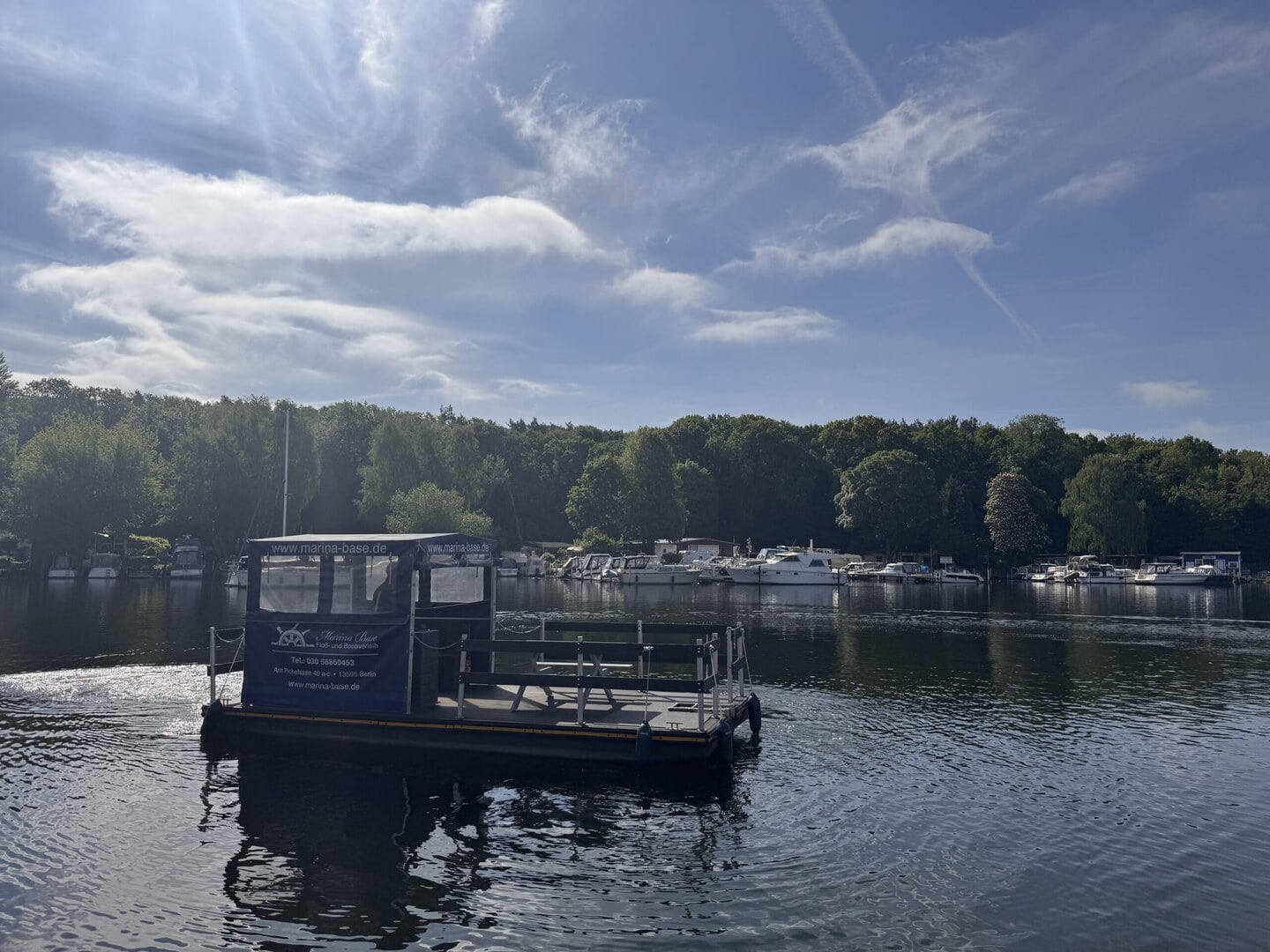 Neues führerscheinfreies Floss für 8 Personen zum feiern, grillen und chillen. Für Familienfeiern, Geburtstage, Junggesellenabschiede, Firmenevents und Tagestouren durch das Seengebiet der Havel und den Wannsee. Mit Tisch und bequemen Sitzmöglichkeiten.